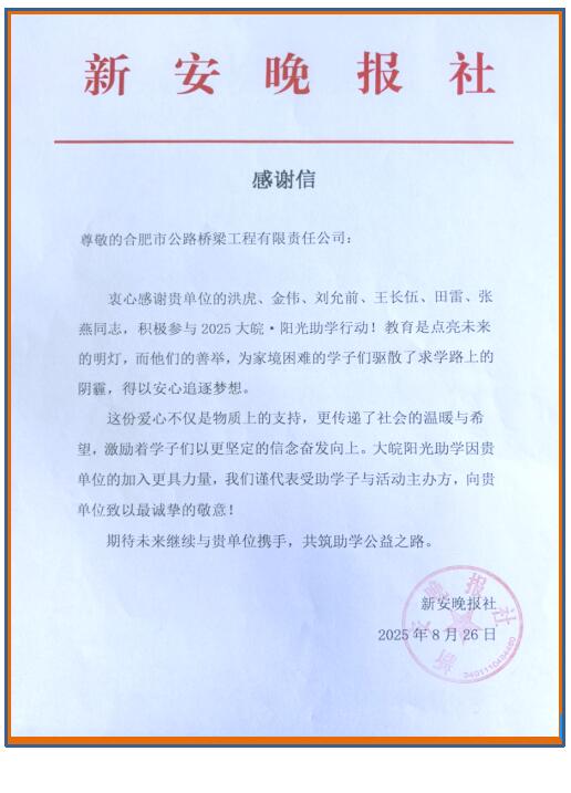 “大皖陽光助學(xué)因貴單位的加入更具力量,我們謹(jǐn)代表受助學(xué)子與活動主辦方,向貴單位致以最誠摯的敬意”,近日,新安晚報社向合肥路橋發(fā)來一封飽含深情的感謝信,對合肥路橋職工積極參與2025大皖・陽光助學(xué)行動表達誠摯謝意。